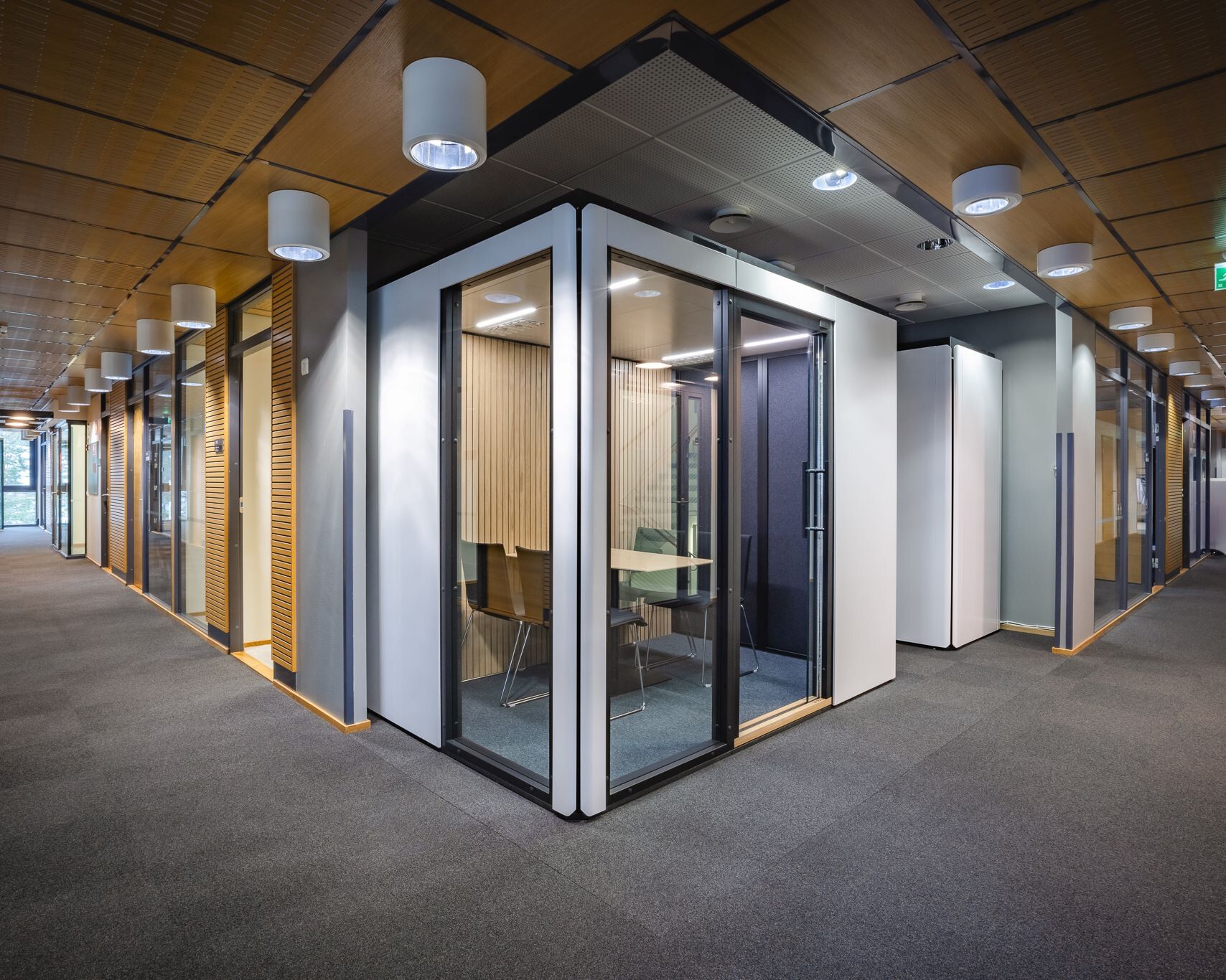 Modulaarisen rakenteen ansiosta huoneen värejä, materiaaleja, kokoa ja asettelua voidaan muuttaa myös käyttöönoton jälkeen. Lisäksi koko tila voidaan tarvittaessa siirtää uuteen sijaintiin – ilman pysyviä muutoksia toimistoon.