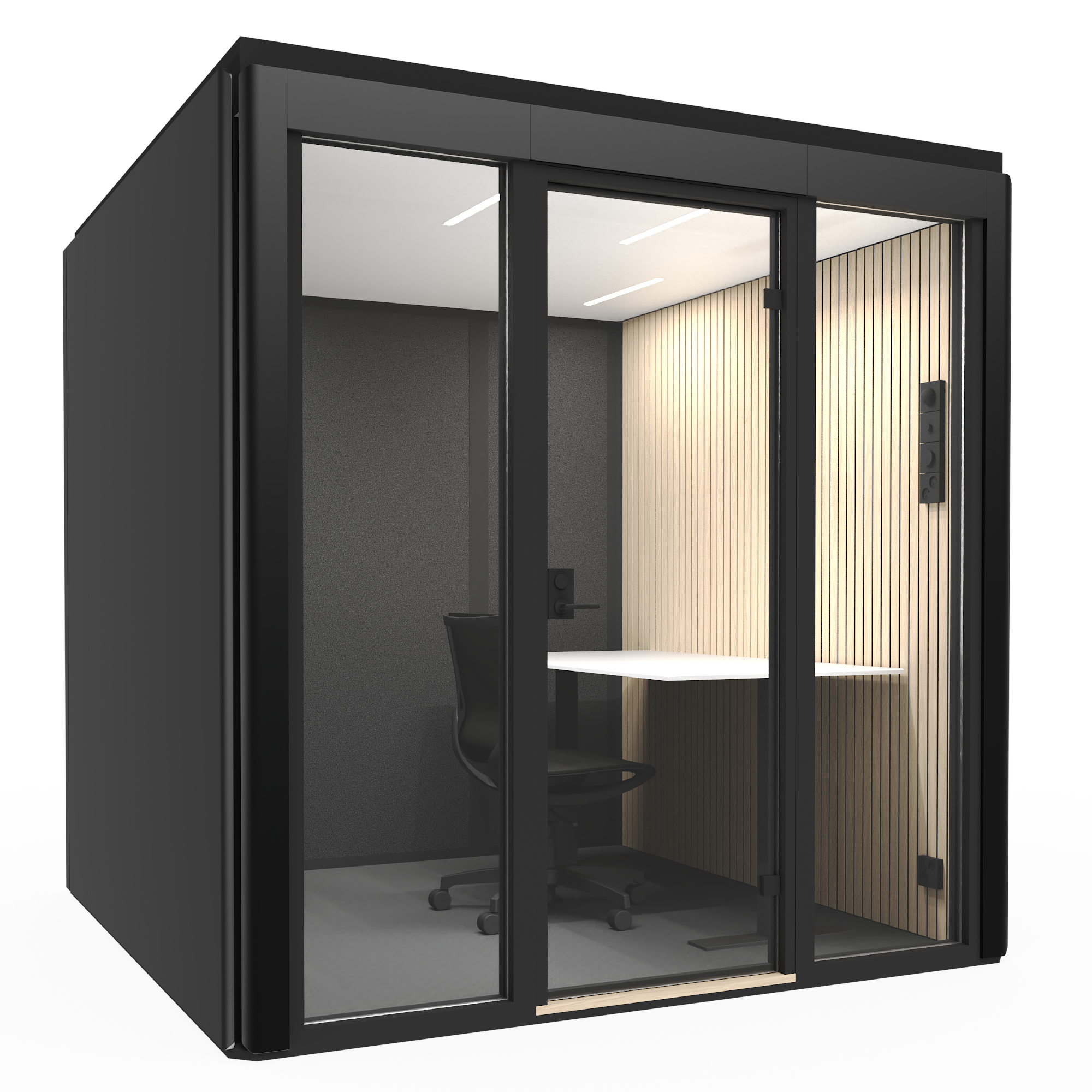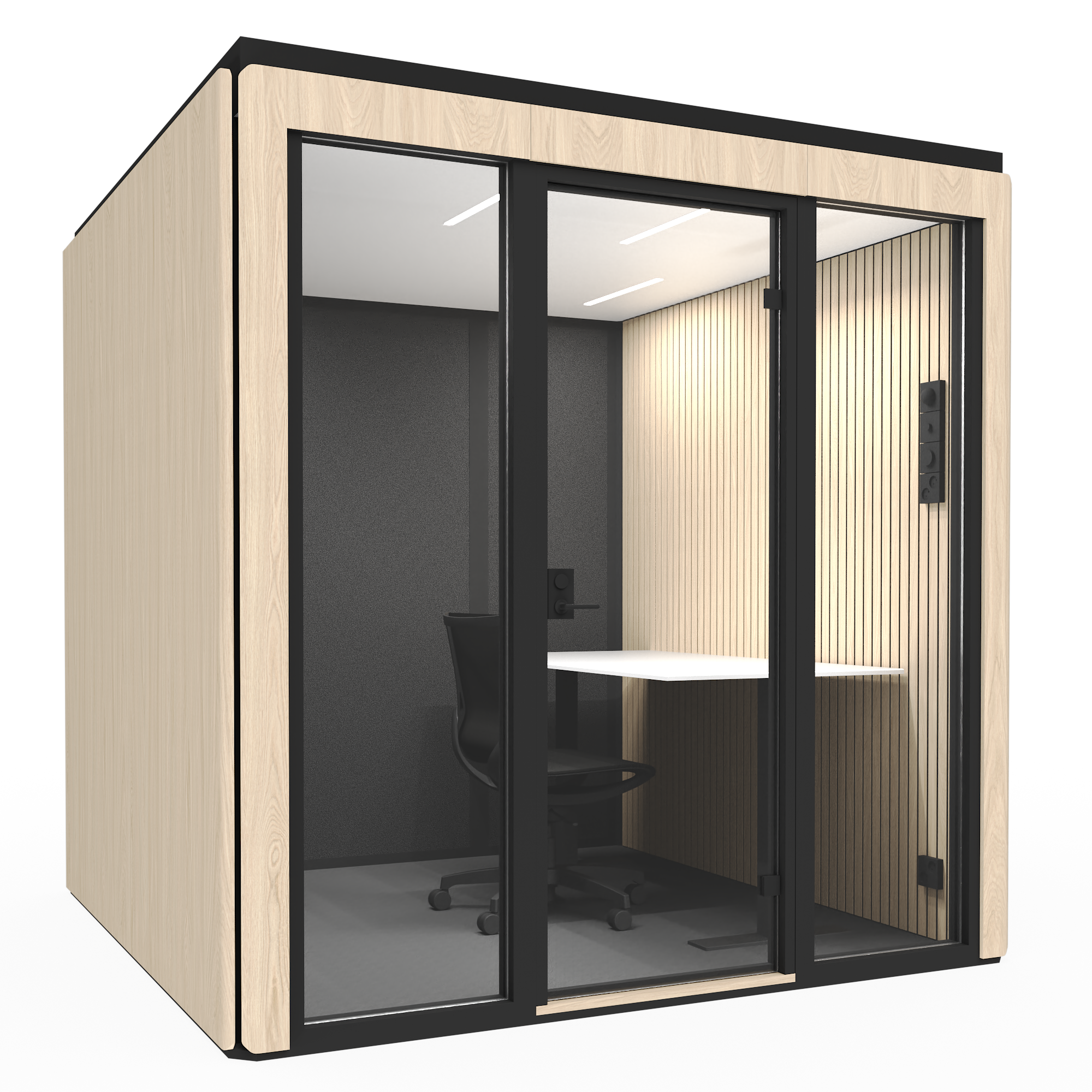 Octacell 2,5X2,5 on yhden hengen äänieristetty työhuone keskittymistä vaativaan työskentelyyn, puheluihin ja verkkokokouksiin. Tilan mitoitus sopii normaalikokoiselle työpöydälle ja ergonomiselle toimistotuolille. Liukuovi tekee sijoittamisen käytävien ja kulkureittien läheisyyteen mahdolliseksi ilman, että ovi vie lisätilaa.