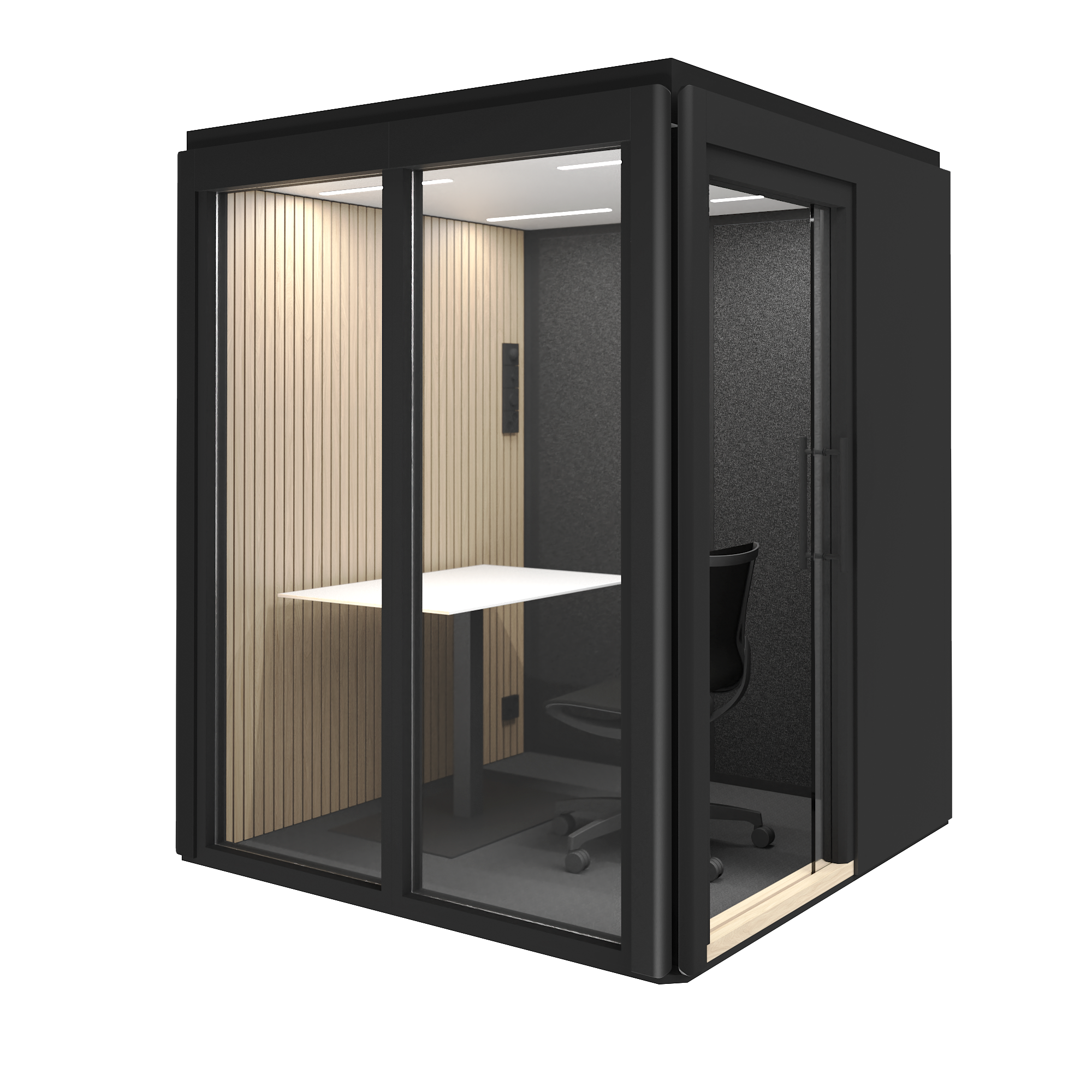 Octacell 2X2 on yhden hengen äänieristetty työhuone keskittymistä vaativaan työskentelyyn, puheluihin ja verkkokokouksiin. Tilan mitoitus sopii normaalikokoiselle työpöydälle ja ergonomiselle toimistotuolille. Liukuovi tekee sijoittamisen käytävien ja kulkureittien läheisyyteen mahdolliseksi ilman, että ovi vie lisätilaa.