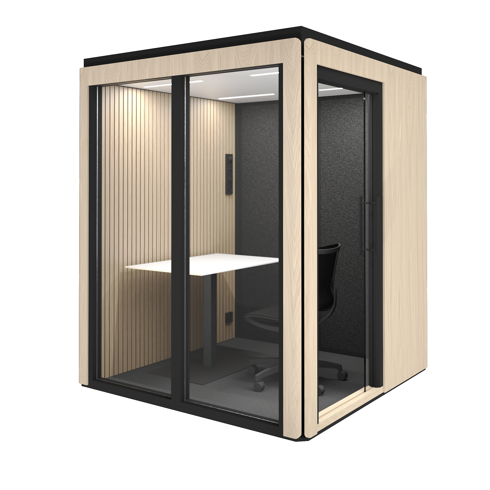 Skaalautuvuus tarkoittaa käytännössä kahta asiaa: ennen työhuoneen asennusta pystymme määrittelemään tilan oven ja lasiseinien paikat, jotta tila sopii juuri teidän toimistoympäristöönne.