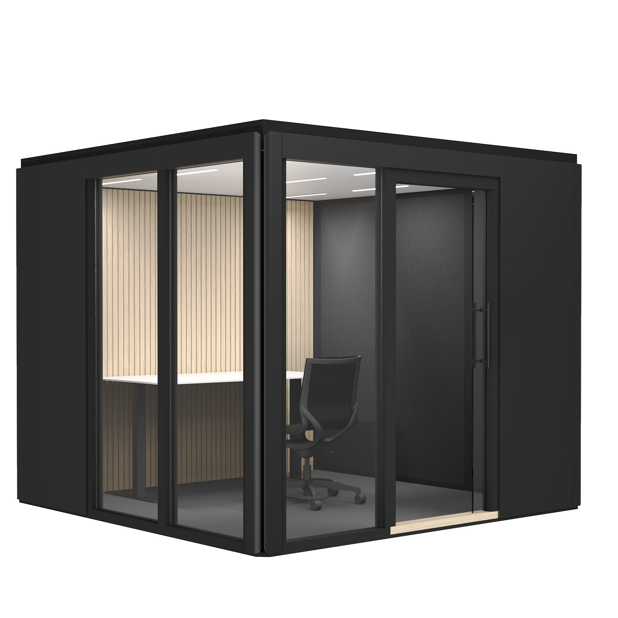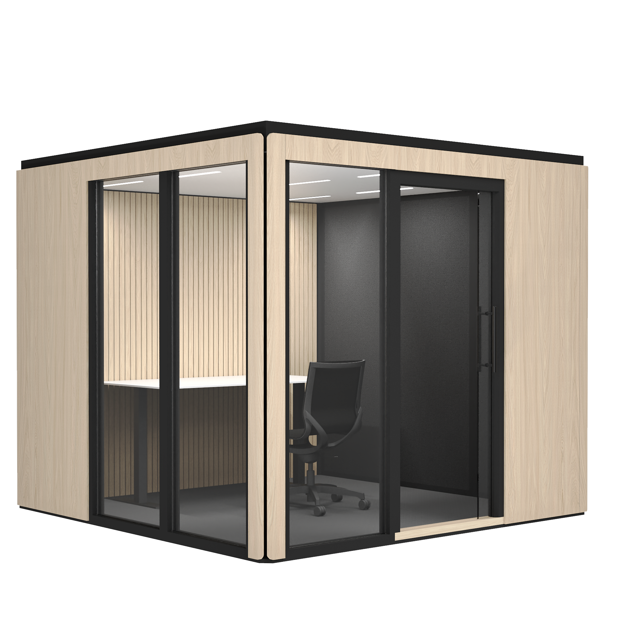 Skaalautuvuus tarkoittaa käytännössä kahta asiaa: ennen työhuoneen asennusta pystymme määrittelemään tilan oven ja lasiseinien paikat, jotta tila sopii juuri teidän toimistoympäristöönne.
