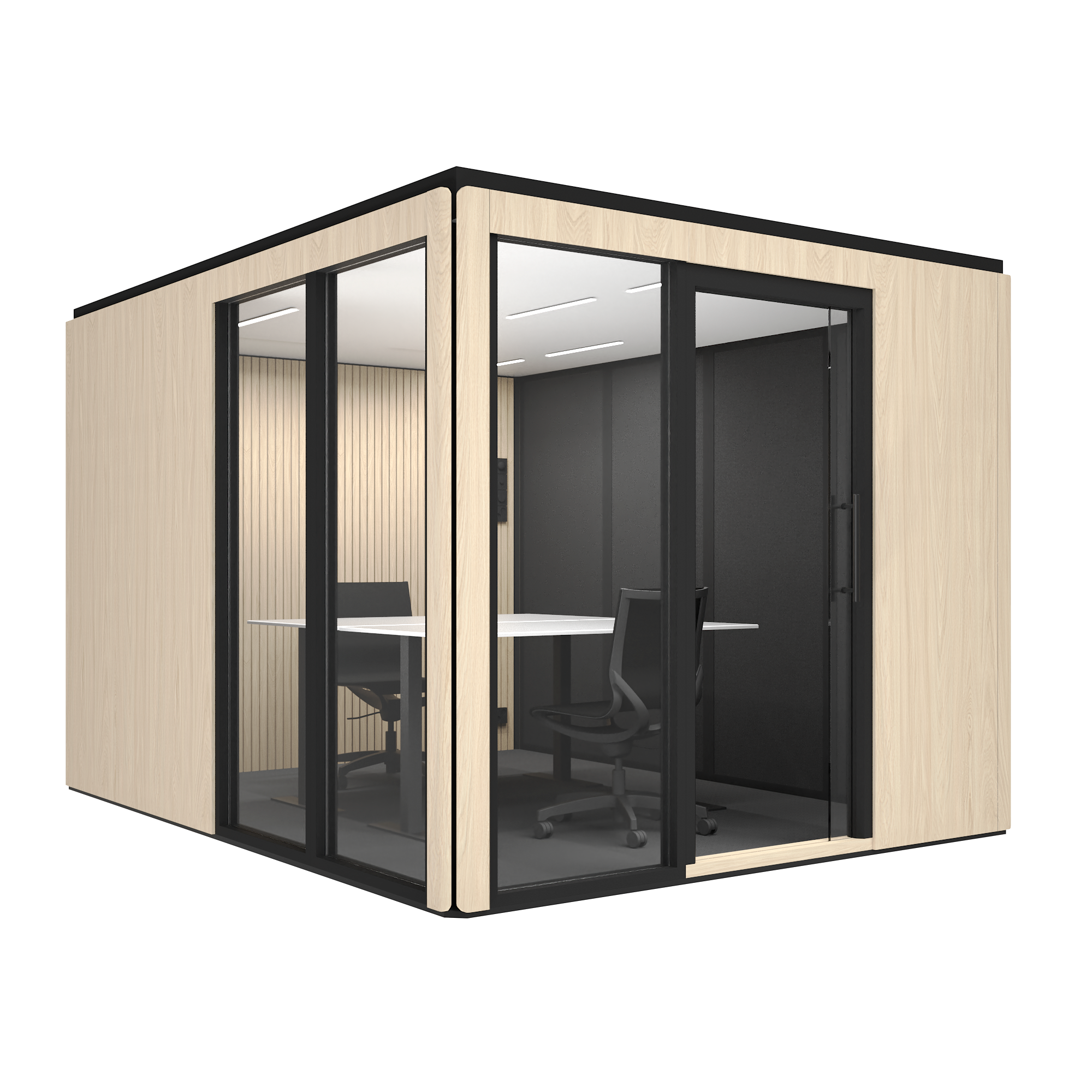 Octacell 4X3 on kahden hengen äänieristetty työhuone keskittymistä vaativaan työskentelyyn, puheluihin ja verkkokokouksiin. Tilan mitoitus sopii normaalikokoiselle työpöydälle ja ergonomiselle toimistotuolille. Liukuovi tekee sijoittamisen käytävien ja kulkureittien läheisyyteen mahdolliseksi ilman, että ovi vie lisätilaa.