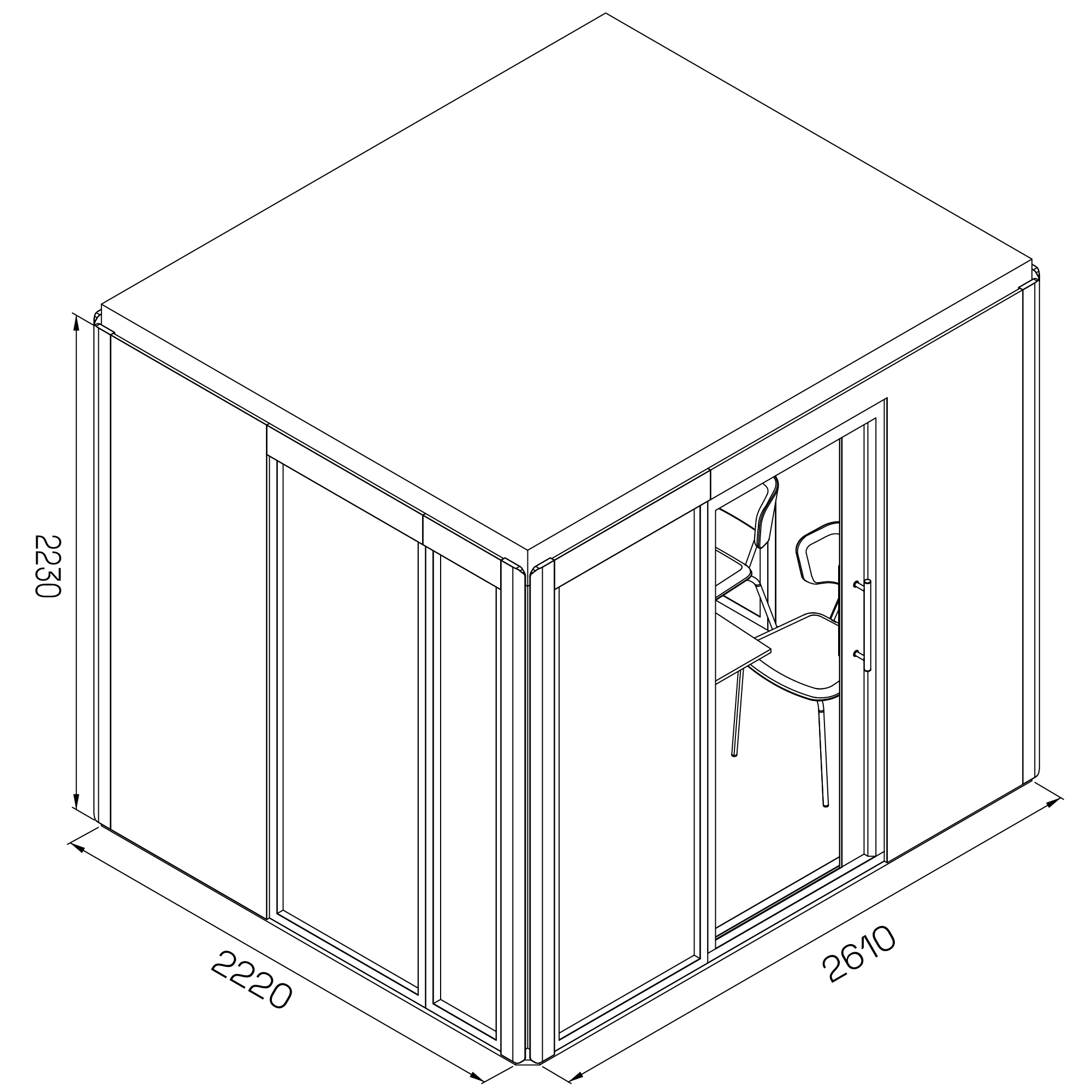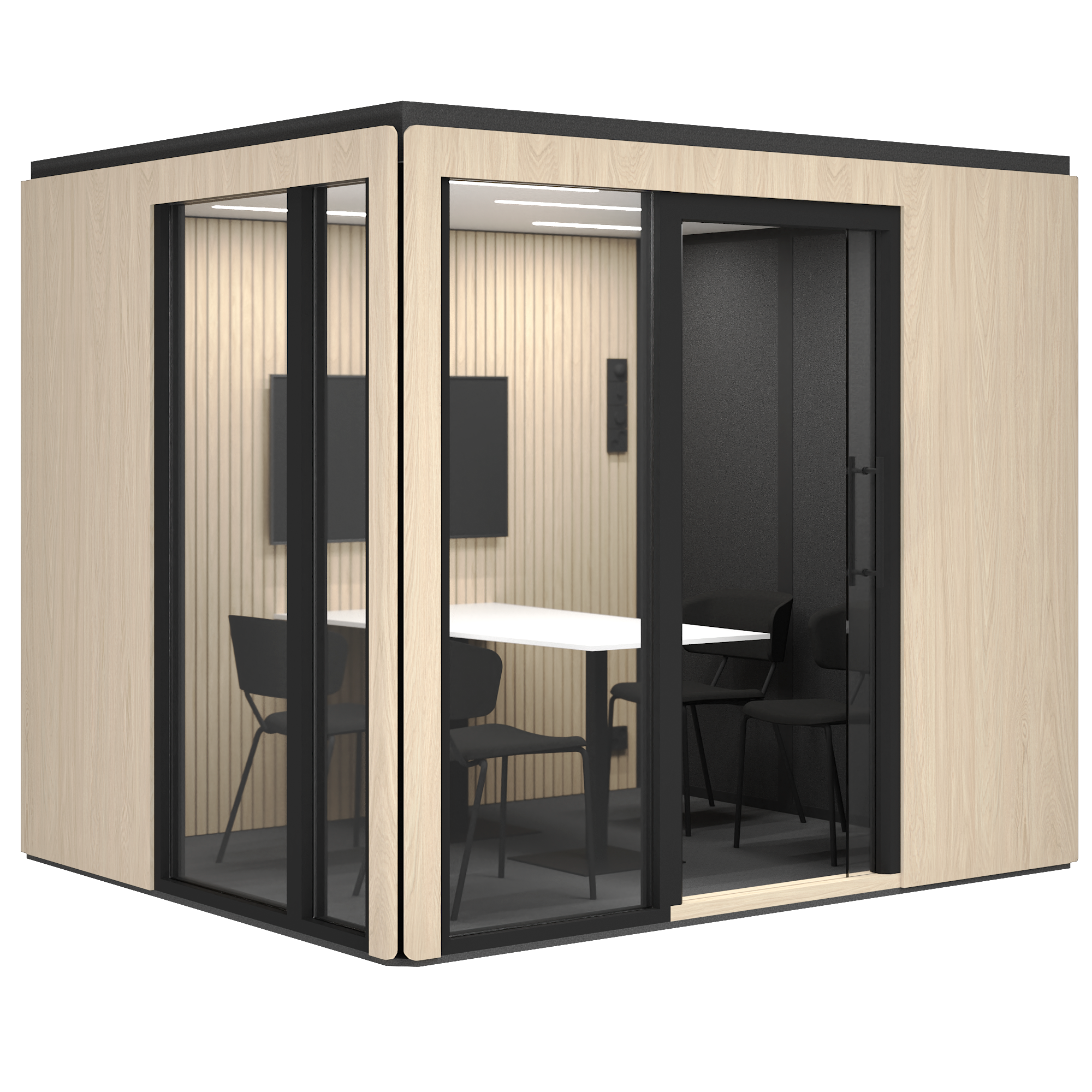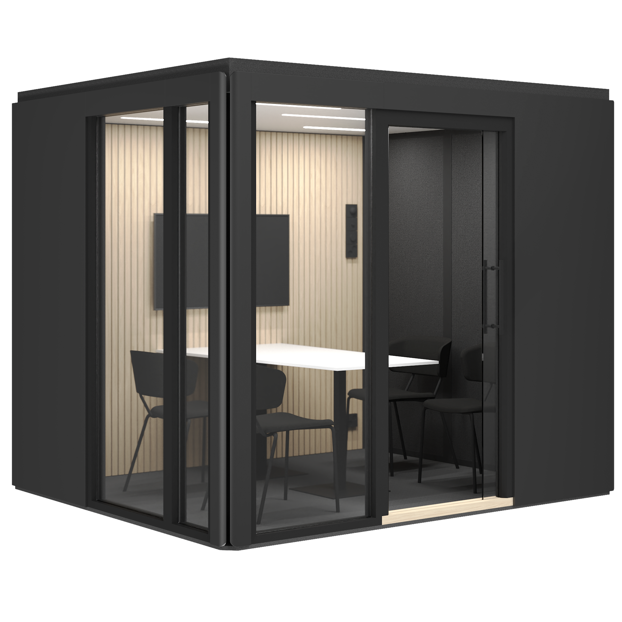 Octacell 3X2,5 är ett kompakt och ljudisolerat mötesrum för 2-4 personer, avsett för konfidentiella samtal och mindre möten. Utrymmet passar för kundmöten, arbetsintervjuer och projektmöten. Den kompakta storleken gör det enkelt att placera rummet i olika delar av kontoret utan större utrymmeskrav.