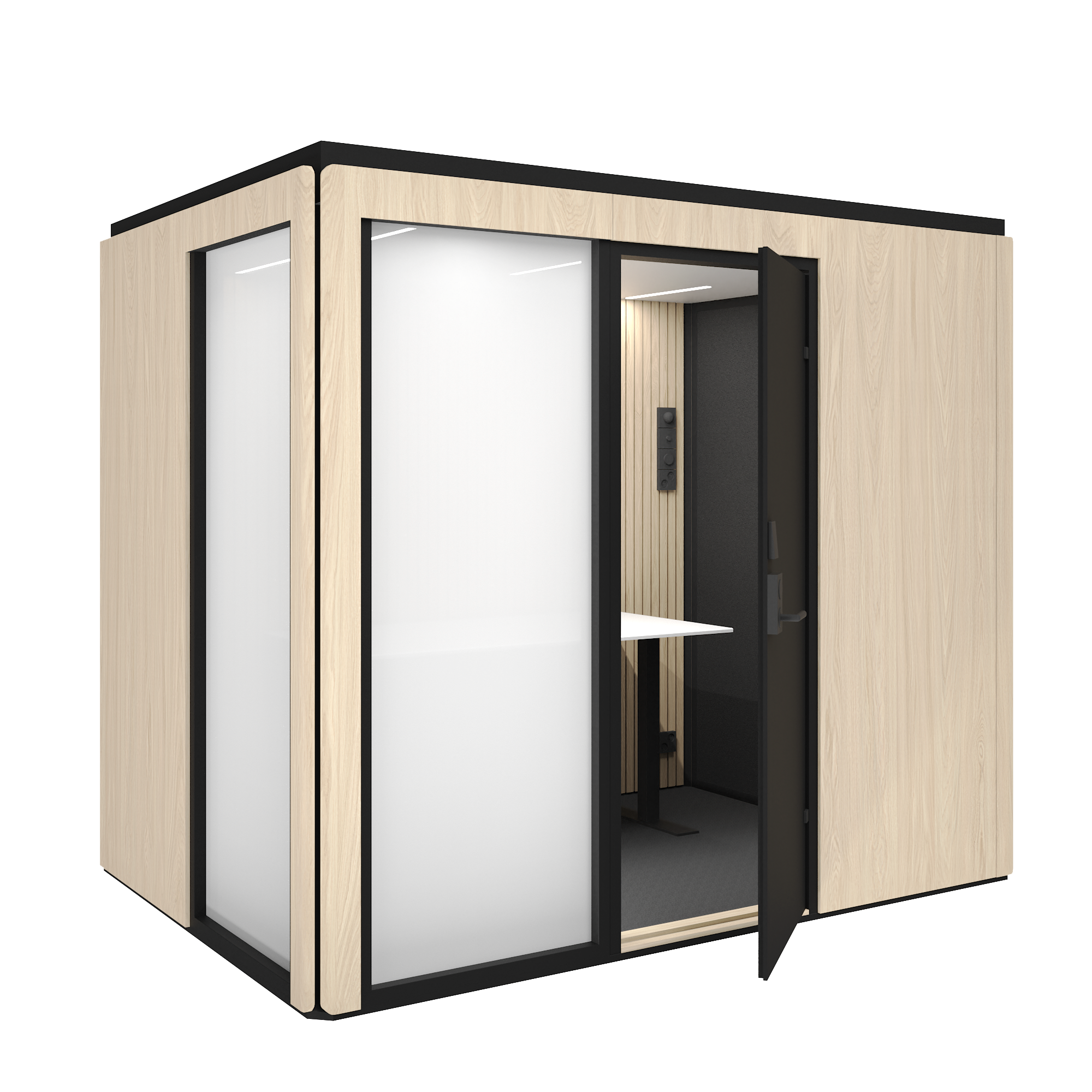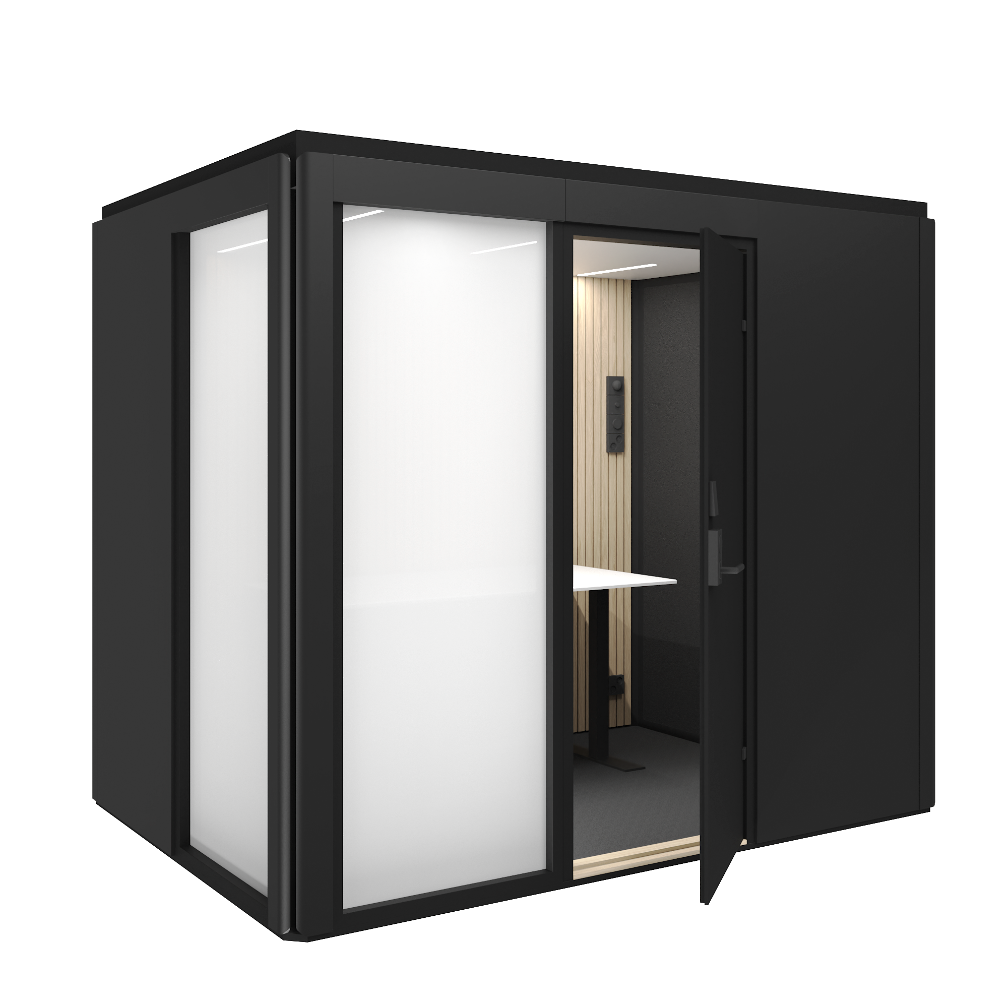 Säkerhetsrummen kan utrustas med en dörr med passerkontroll som säkerställer kontrollerad åtkomst. Ljudisolering i klass A skyddar samtal och arbete från yttre störningar, och den visuellt skyddade miljön förhindrar insyn från obehöriga. Lösningen lämpar sig för situationer där informationssäkerhet, integritet och kontrollerad användning är centrala krav.