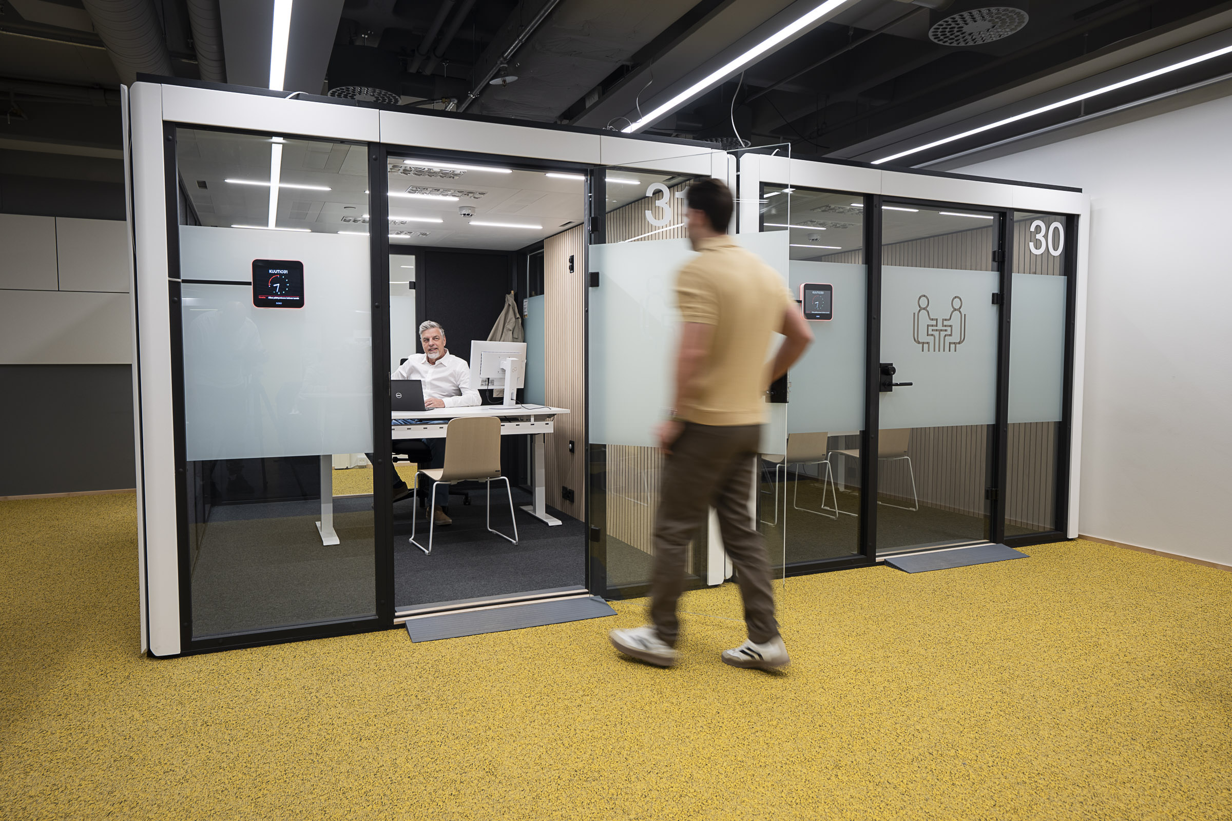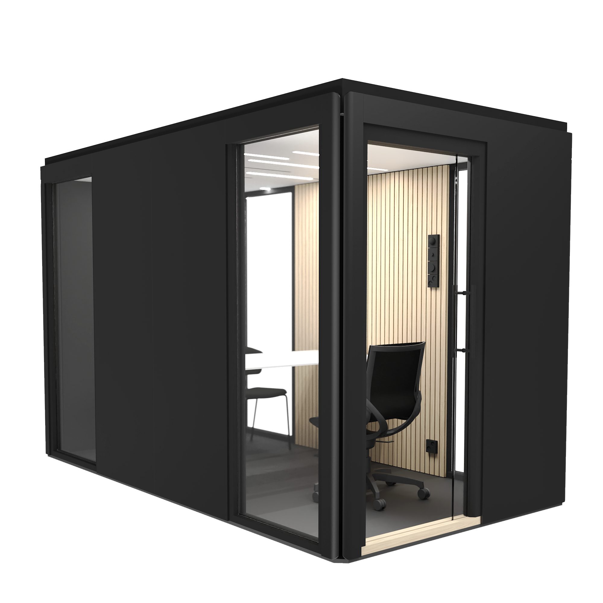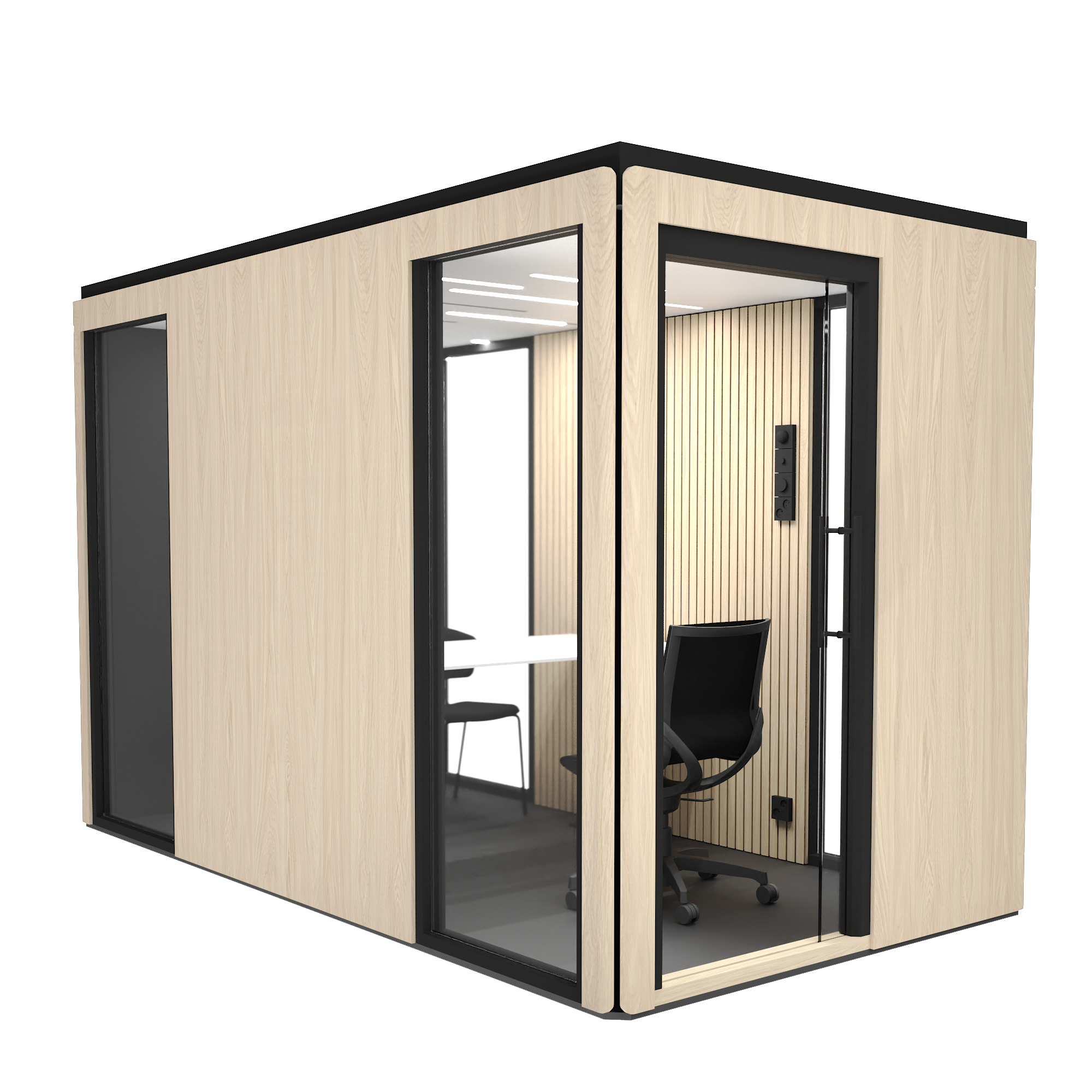 Skalbarhet innebär att rummen kan anpassas både före och efter montering. Inför montering planeras placeringen av dörrar och glasväggar så att rummet passar kontorsmiljön.