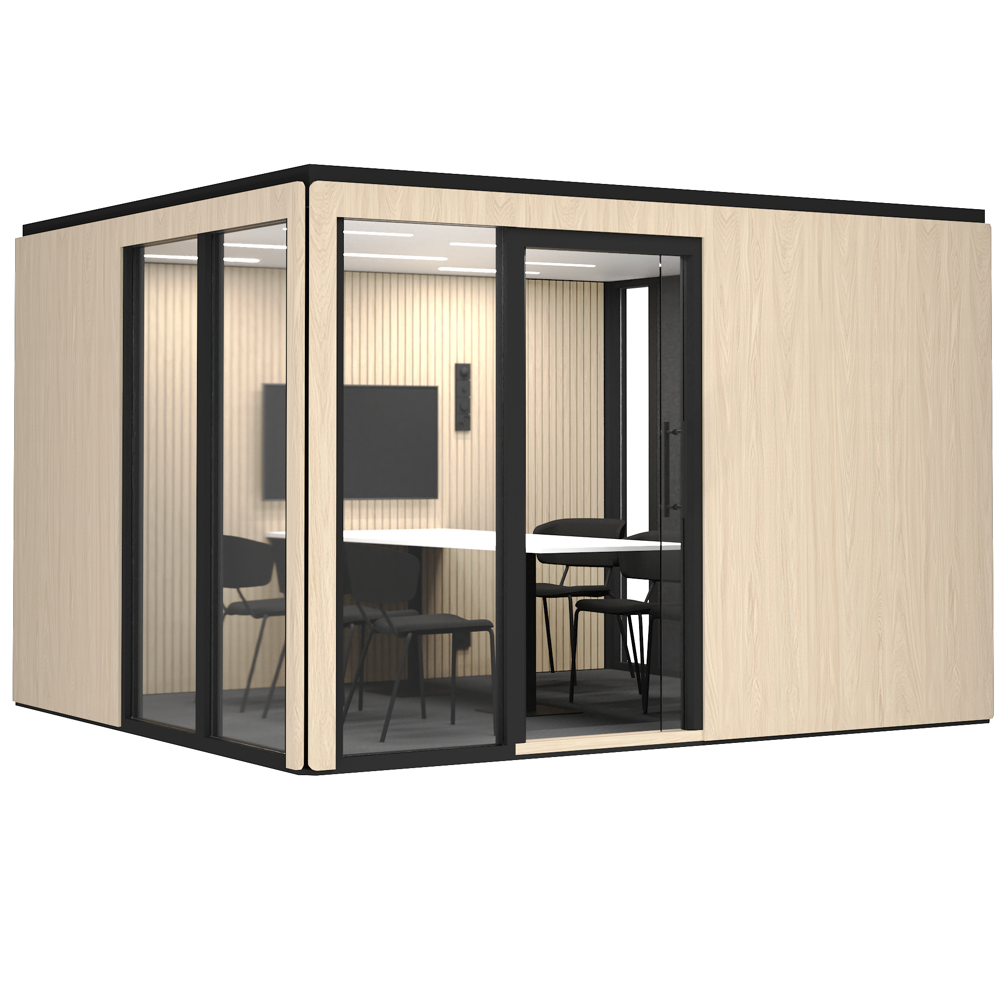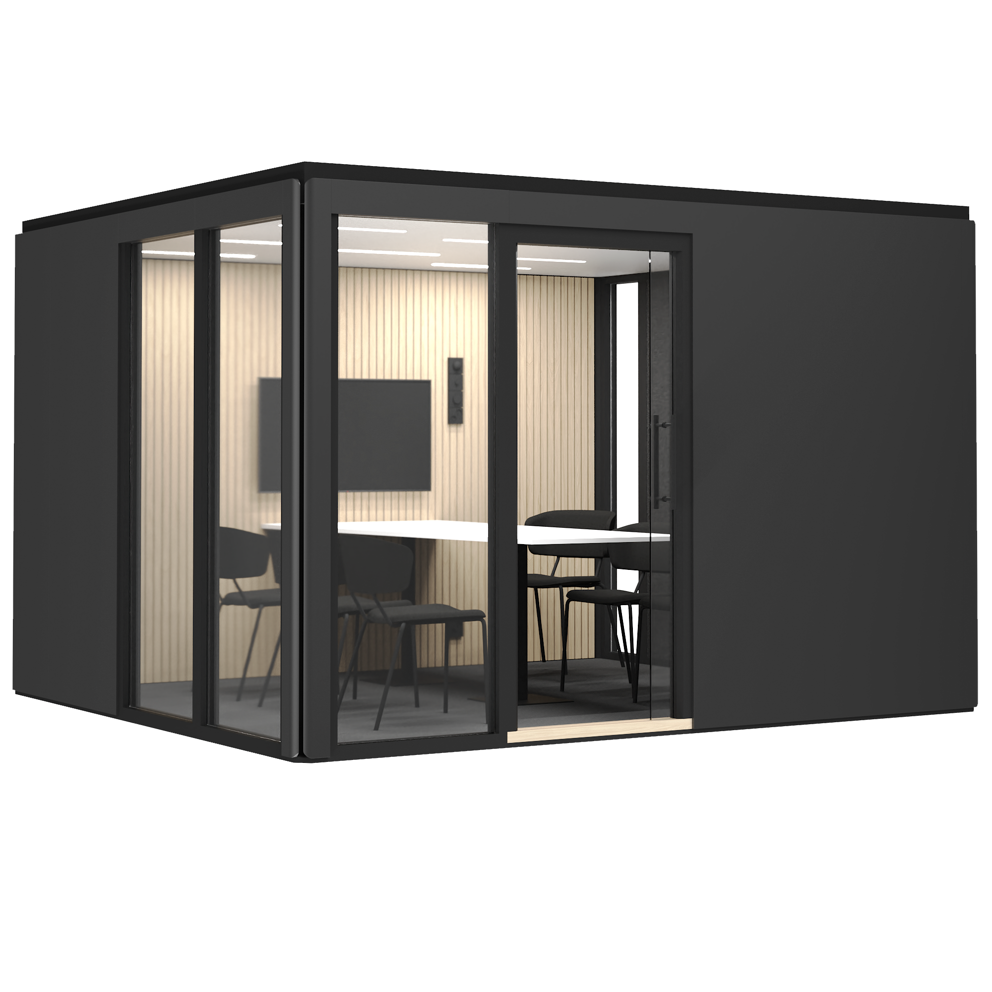 Priserna för mötesrum med standardutrustning visas på vår webbplats. Utöver produktpriset tillkommer montering och leverans. Montering och leverans från 12 000 kr (exkl. moms).