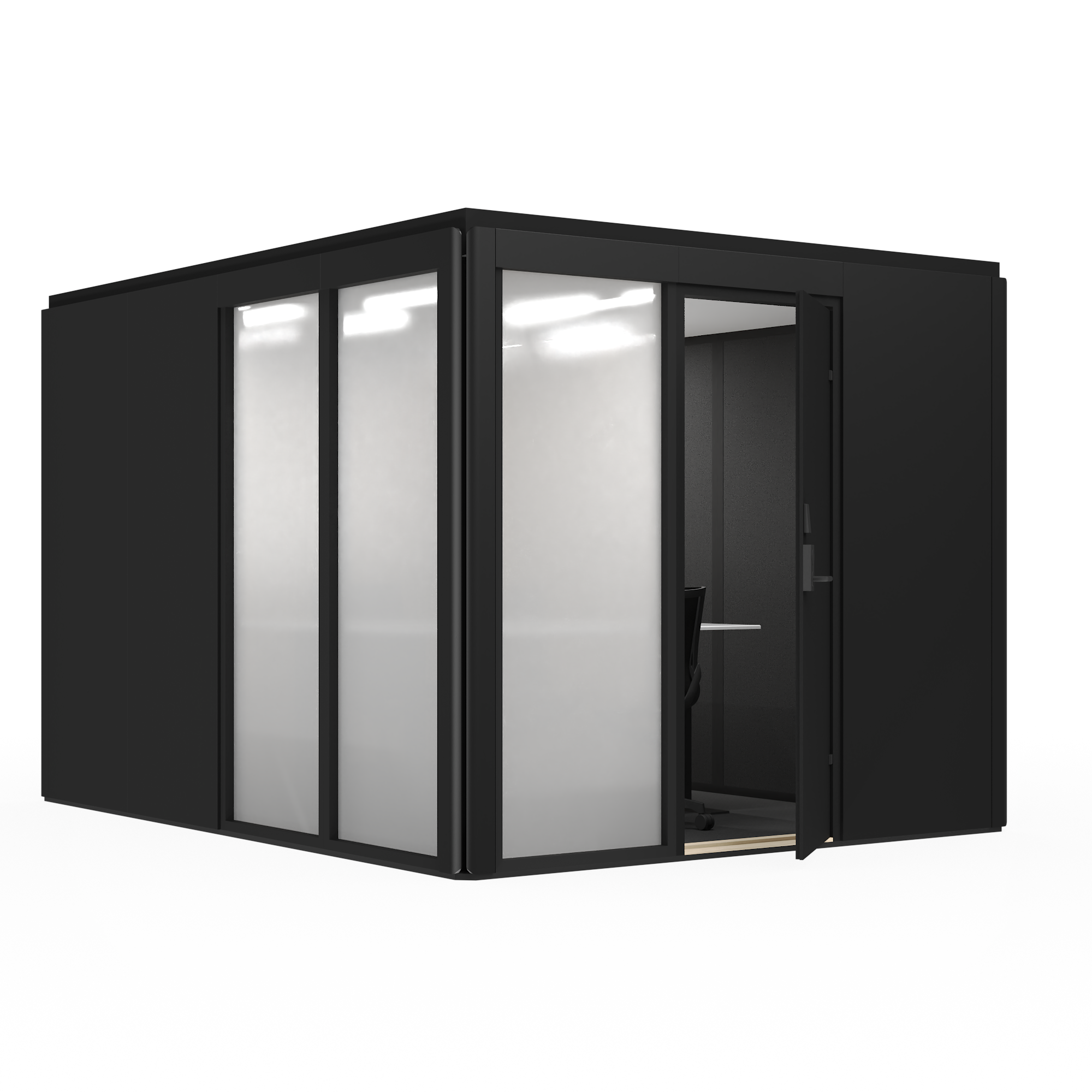 Säkerhetsrummen kan utrustas med en dörr med passerkontroll som säkerställer kontrollerad åtkomst. Ljudisolering i klass A skyddar samtal och arbete från yttre störningar, och den visuellt skyddade miljön förhindrar insyn från obehöriga. Lösningen lämpar sig för situationer där informationssäkerhet, integritet och kontrollerad användning är centrala krav.
