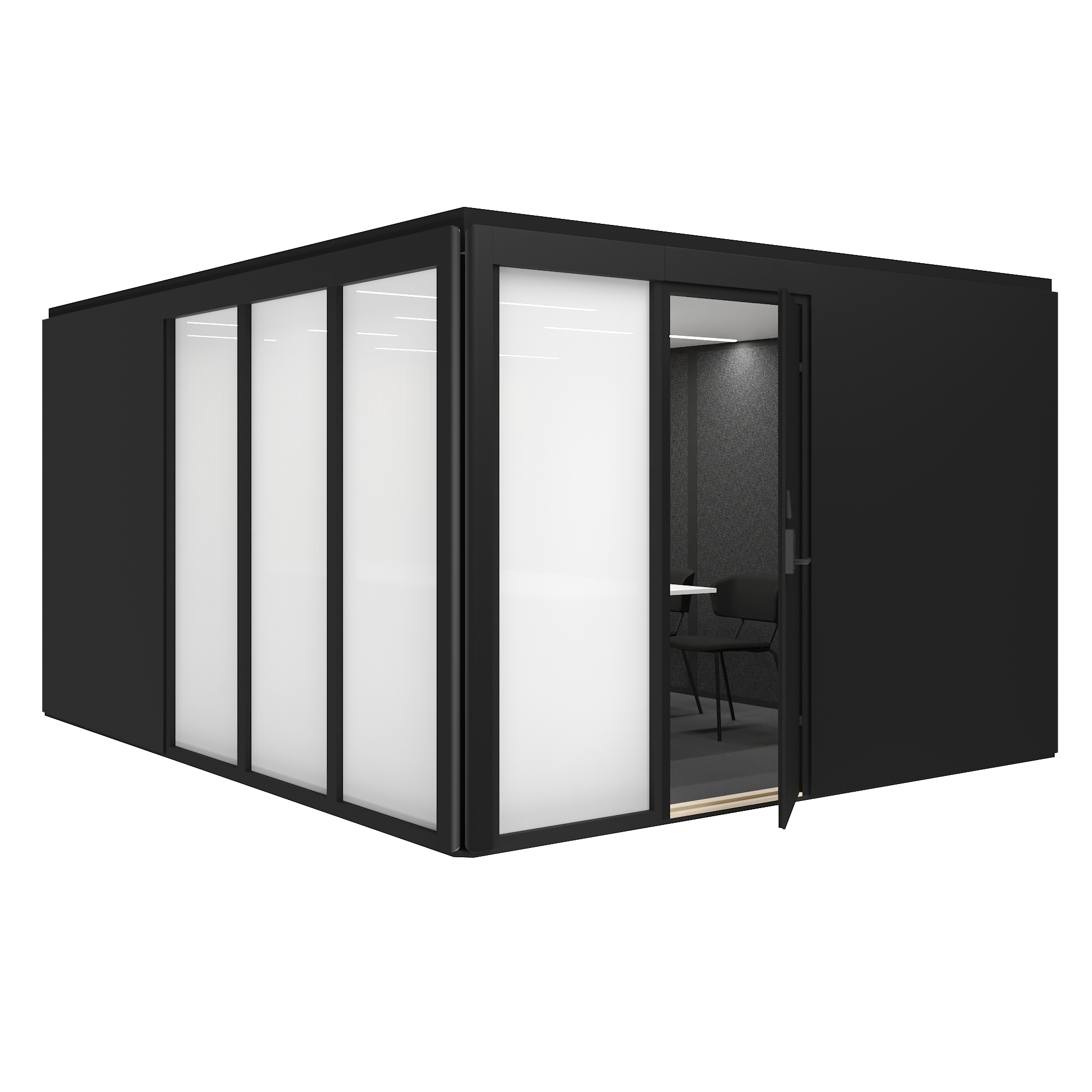 Säkerhetsrummen kan utrustas med en dörr med passerkontroll som säkerställer kontrollerad åtkomst. Ljudisolering i klass A skyddar samtal och arbete från yttre störningar, och den visuellt skyddade miljön förhindrar insyn från obehöriga. Lösningen lämpar sig för situationer där informationssäkerhet, integritet och kontrollerad användning är centrala krav.