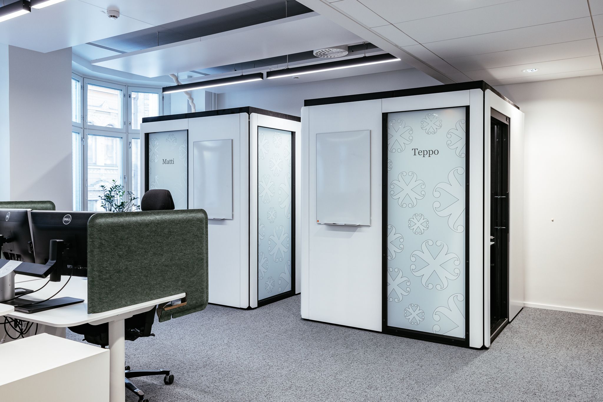 ”2021 flyttade Fondias huvudkontor, Fondia House, till nya lokaler, där ett kontor med flera utrymmen som stödjer modernt arbete byggdes. Genom att lyssna på advokaternas önskemål upphandlar vi Octacell-arbetsrum som ska placeras på öppet kontor, där du enkelt och utan att störa andra kan gå igenom handlingarna med klienten via telefon. Vi designade tejper efter vårt varumärke på lokalens väggglas som en visuell barriär och fäste whiteboardtavlor på utsidan så att båsens fulla potential utnyttjades.